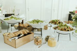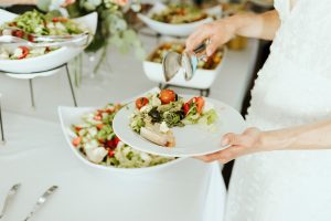 Morsian nostaa salaattia lautaselleen buffetpöydässä.
